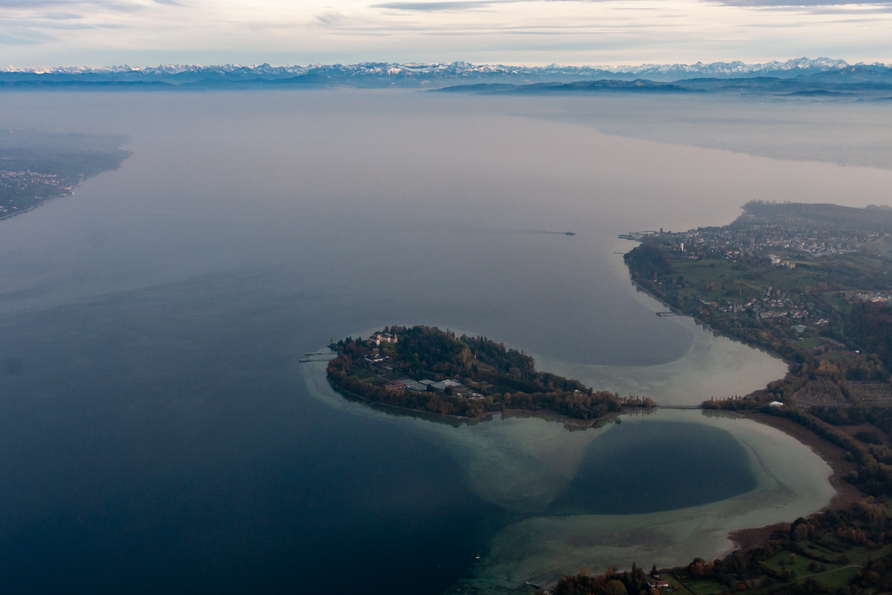 Bodensee mit Insel Mainau vor alpiner Kulisse